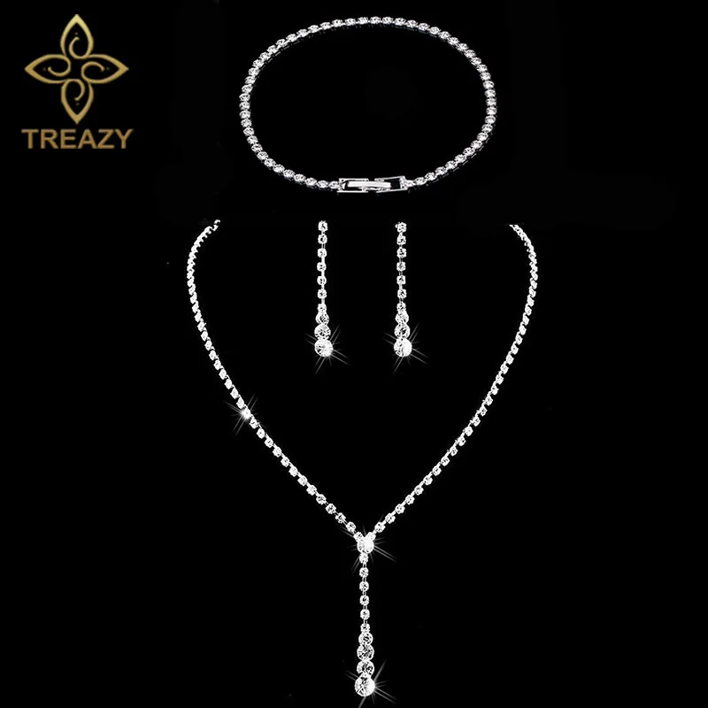 awesome TREAZY Silver Color Simple Crystal Bridal Jewelry Sets Long Drop Necklace Earrings Bracelet Set for